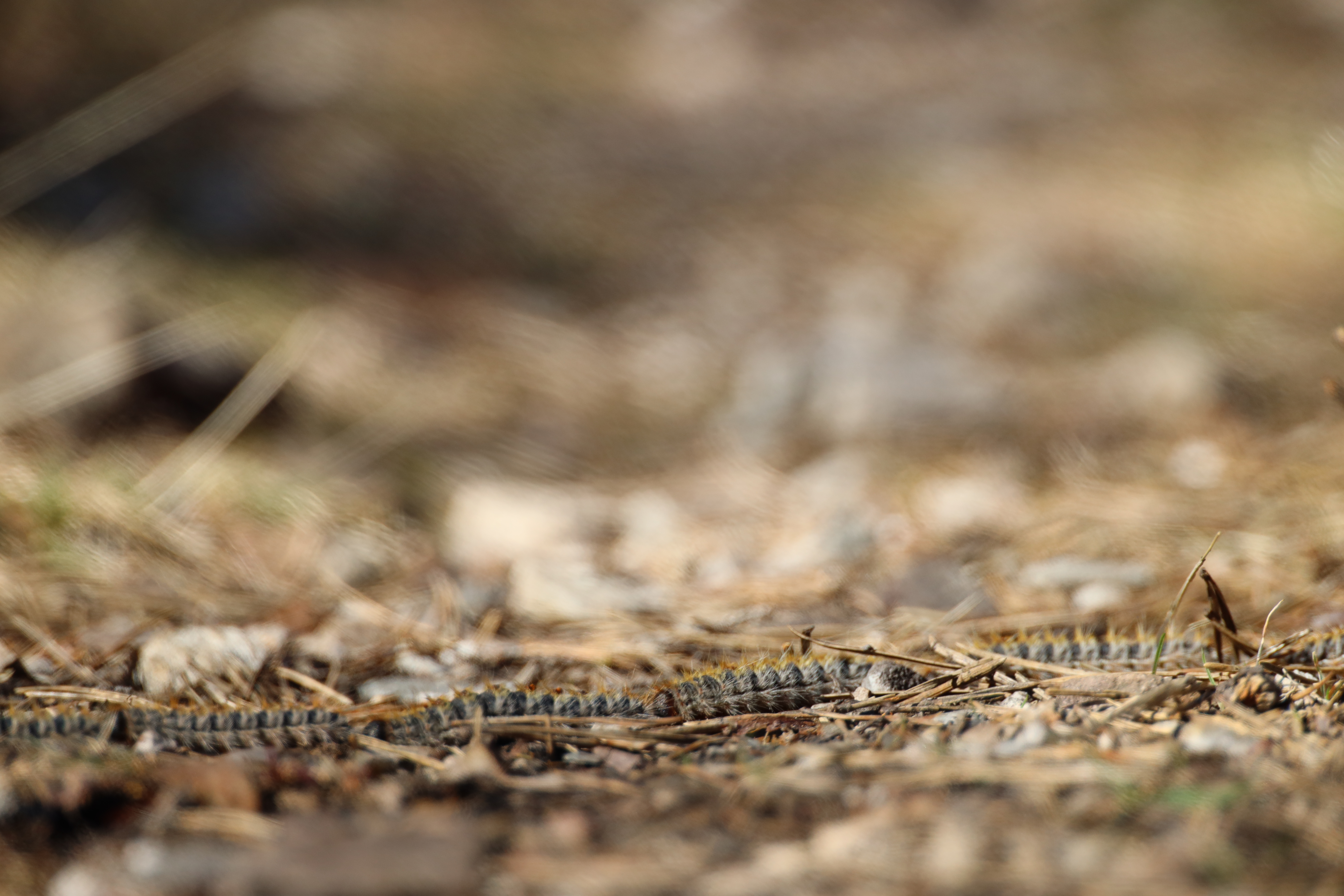 On the walk today we saw a few of these caterpillar trails. They were touching head to bum in a row of about nearly two meters. A little bit of research shows that these are all following the pheromones of one female and are heading into the ground to cocoon themselves.