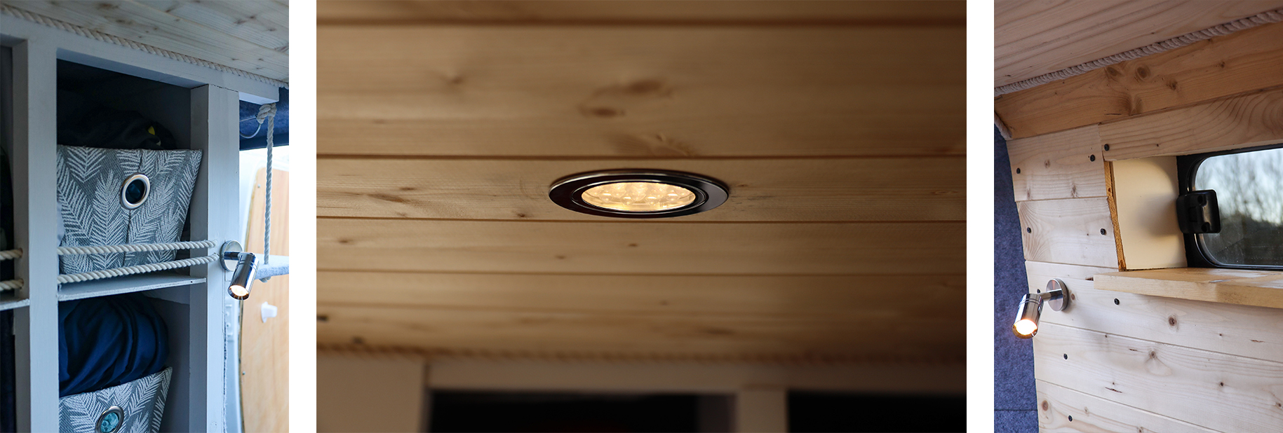In the bed area we went for a selection of lighting including overhead and reading lights. It is so useful having both depending on whether reading in bed or getting clothes out of the cupboard area.